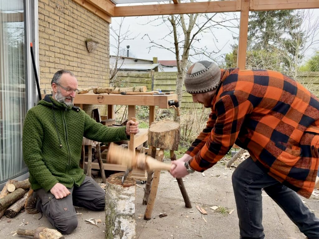 De meesten van ons werken met eigen gereedschappen, maar heb je nog niet alle gereedschappen, dan zijn er altijd gereedschappen beschikbaar om te gebruiken. We hebben bijvoorbeeld goede houtsnijmessen, lepelmessen, bijlen van verschillende goede merken, een zaag, splijtijzer en wiggen en nog veel meer dat je kunt gebruiken. Zo kun je uitproberen wat je bevalt, voordat je zelf gereedschappen aanschaft. Daarbij kunnen we je ook adviseren.