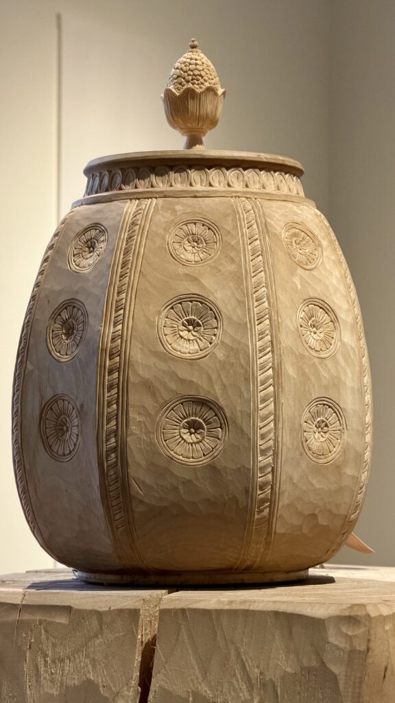 “Ik kloof en hak het hout volgens een gevoel in mij; een gevoel dat ik wil vormgeven. Het kan iets zijn waar ik op dat moment naar verlang, of waarvan ik denk dat de ontvanger het nodig heeft. Misschien een sierlijke lichtheid of een aardende zwaarte in het ritme van het patroon.’